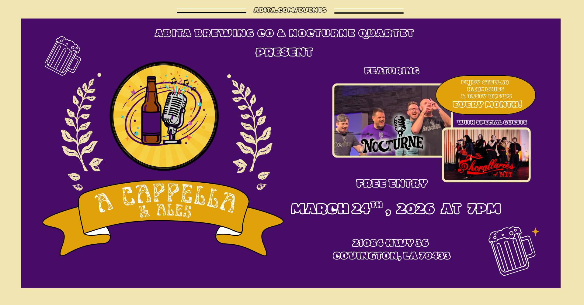 Join Abita Brewing Company and award-winning vocal quartet Nocturne for a one-of-a-kind monthly concert series that celebrates the raw power of the human voice. Hosted at the historic Abita Tap Room, "A Cappella & Ales" pairs the finest Louisiana craft brews with the region's most talented vocal ensembles.